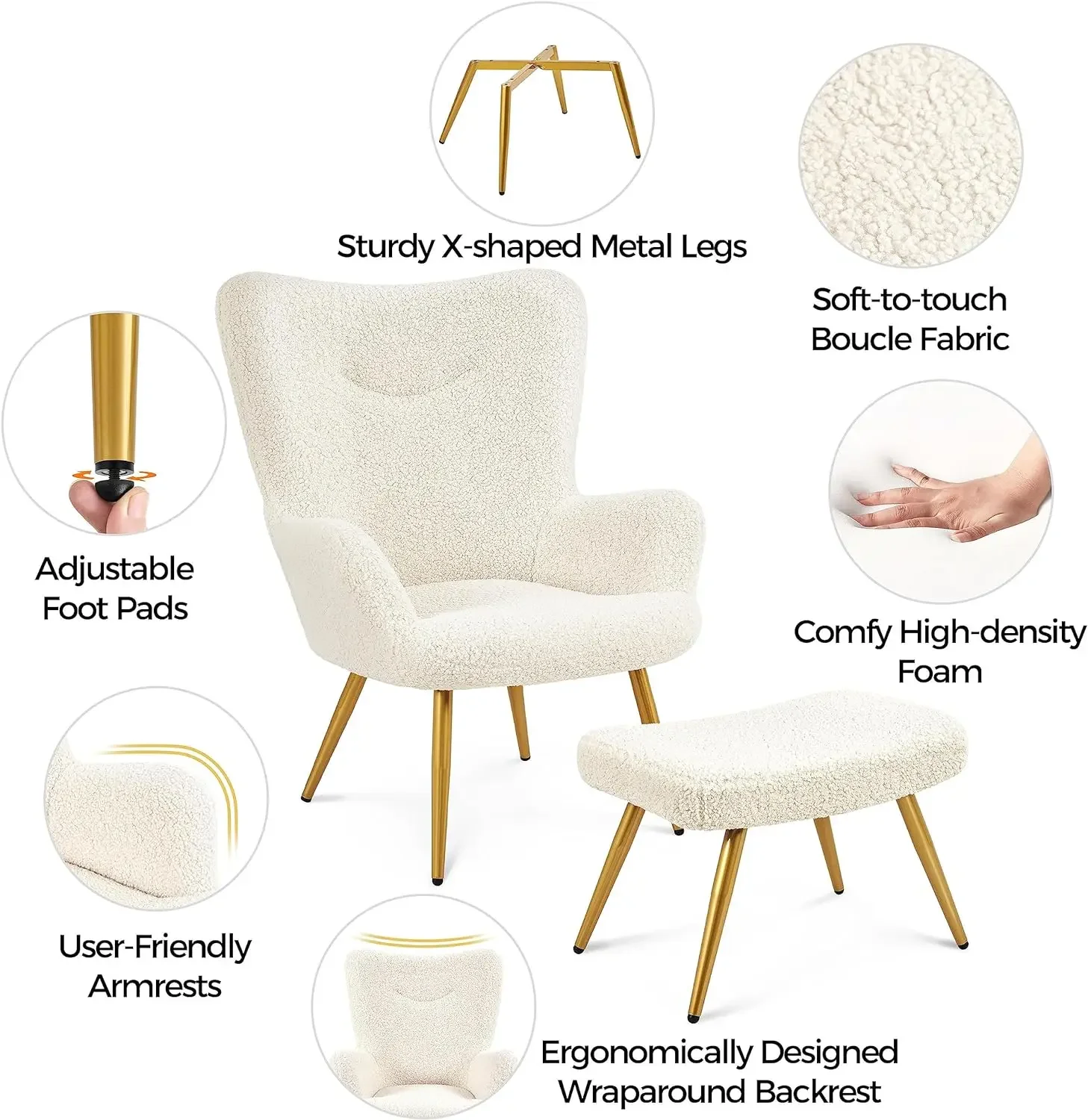 - 【Solidly Constructed for Long-term Use】Elevated on four sturdy metal legs, this elegant accent chair set is crafted from high-quality engineered wood frame, boucle fabric upholstery and high resilient foam, with a weight capacity of 300lbs for the chair, and 216lbs for the ottoman.