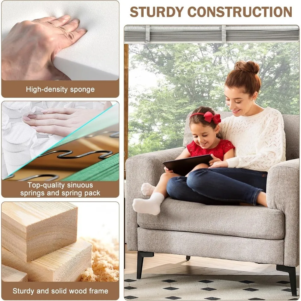 - ✔【Premium Material】upholstery and front-edge wood trim , solid wood frame with concealed stabilizing feet; performance linen fabric upholstery and front-edge wood trim, suspension for long lasting comfort and support ,The maximum load capacity of this product is 350LBS.