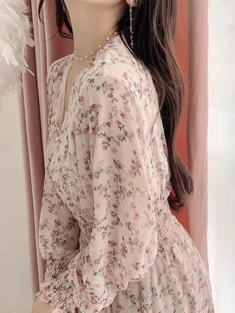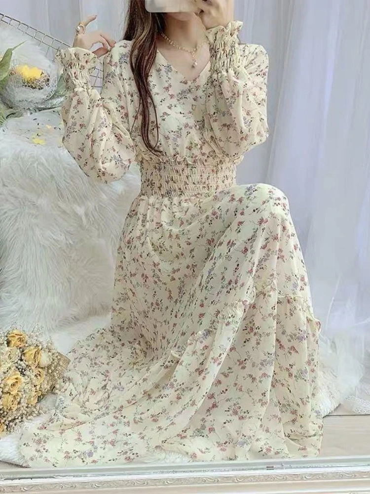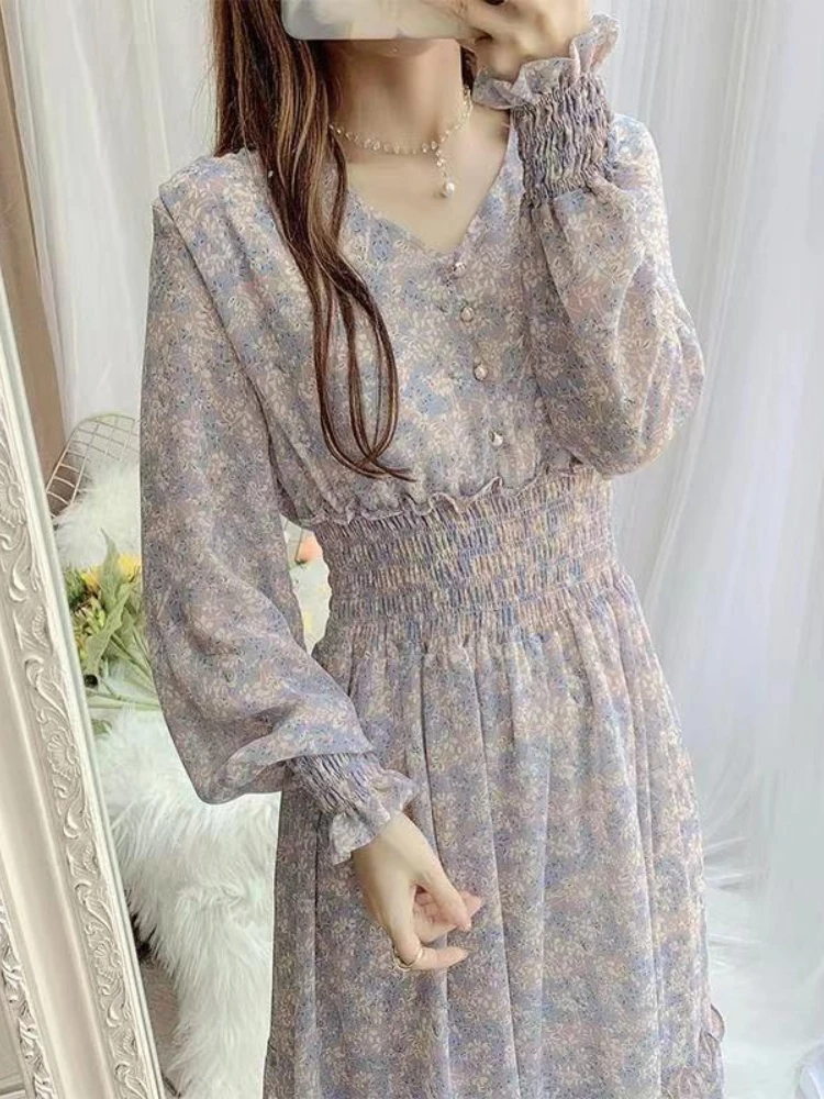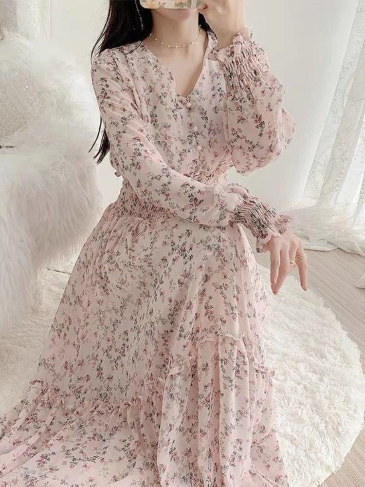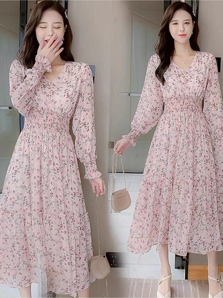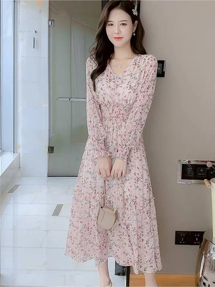 Chiffon Ruffle Slim Folds Casual Print Floral Dress Summer Long Sleeve Dresses New Spring Korean Fashion Elegant Womens Clothing