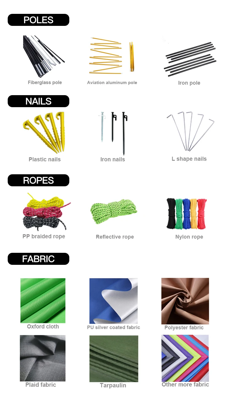 We are the factory,Accept all kinds of customization, like LOGO, COLOR, ACCESSORIES, POLES. NAILS ROPES,FABRIC.