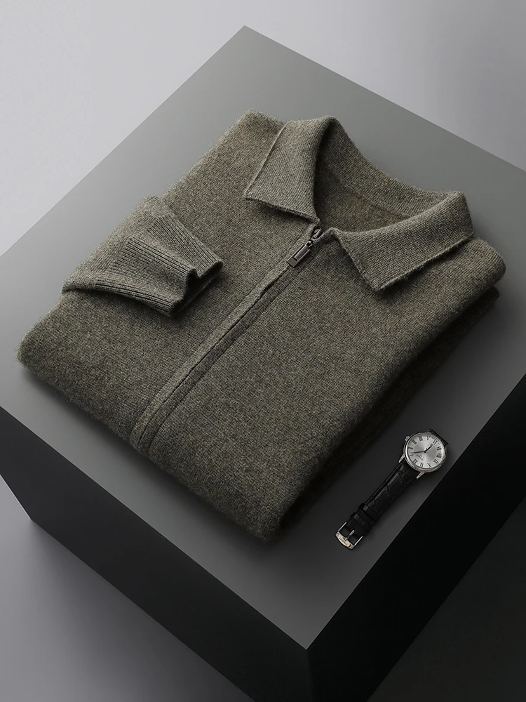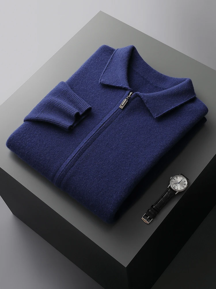 Luxury Autumn Winter Men Cashmere Sweater Thick Warm Zipper Cardigan 100% Merino Wool Knitwear Polo Collar Top Smart Casual Coat