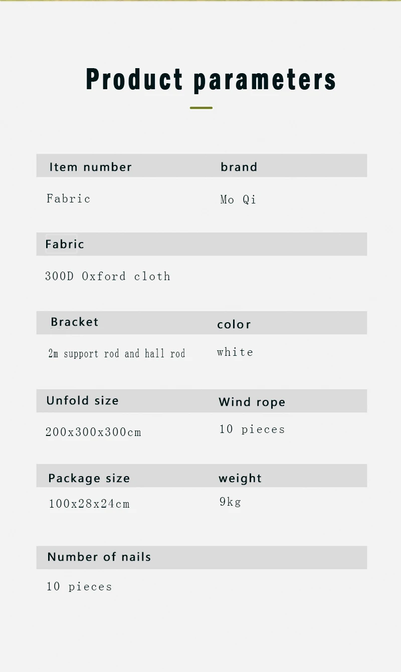 Tent x1; 3M Guy line x10, Stake : 5*7cm x10,Carry Bag x1