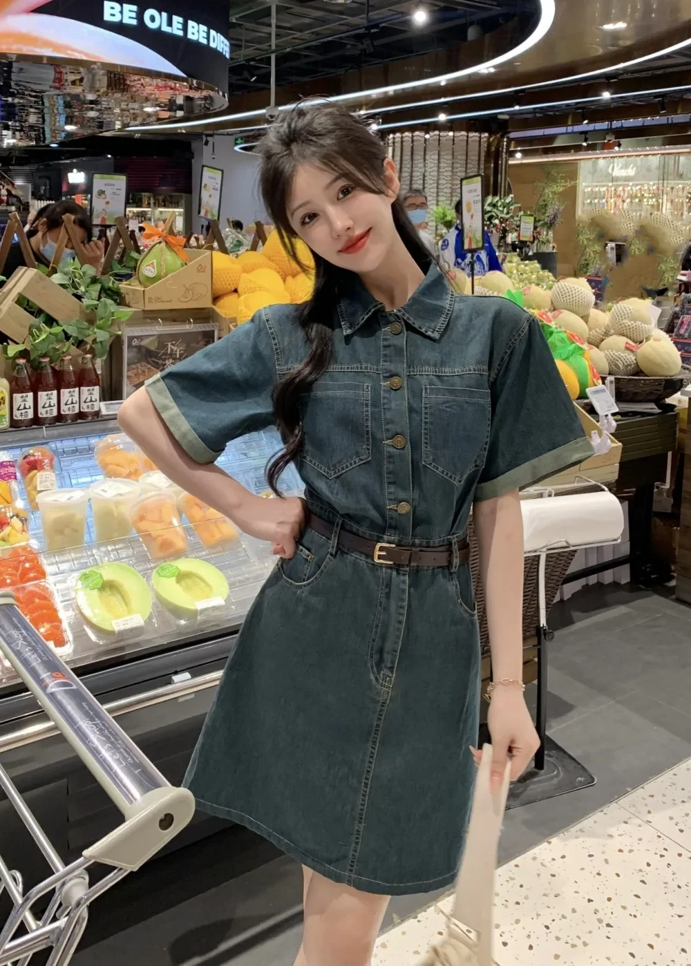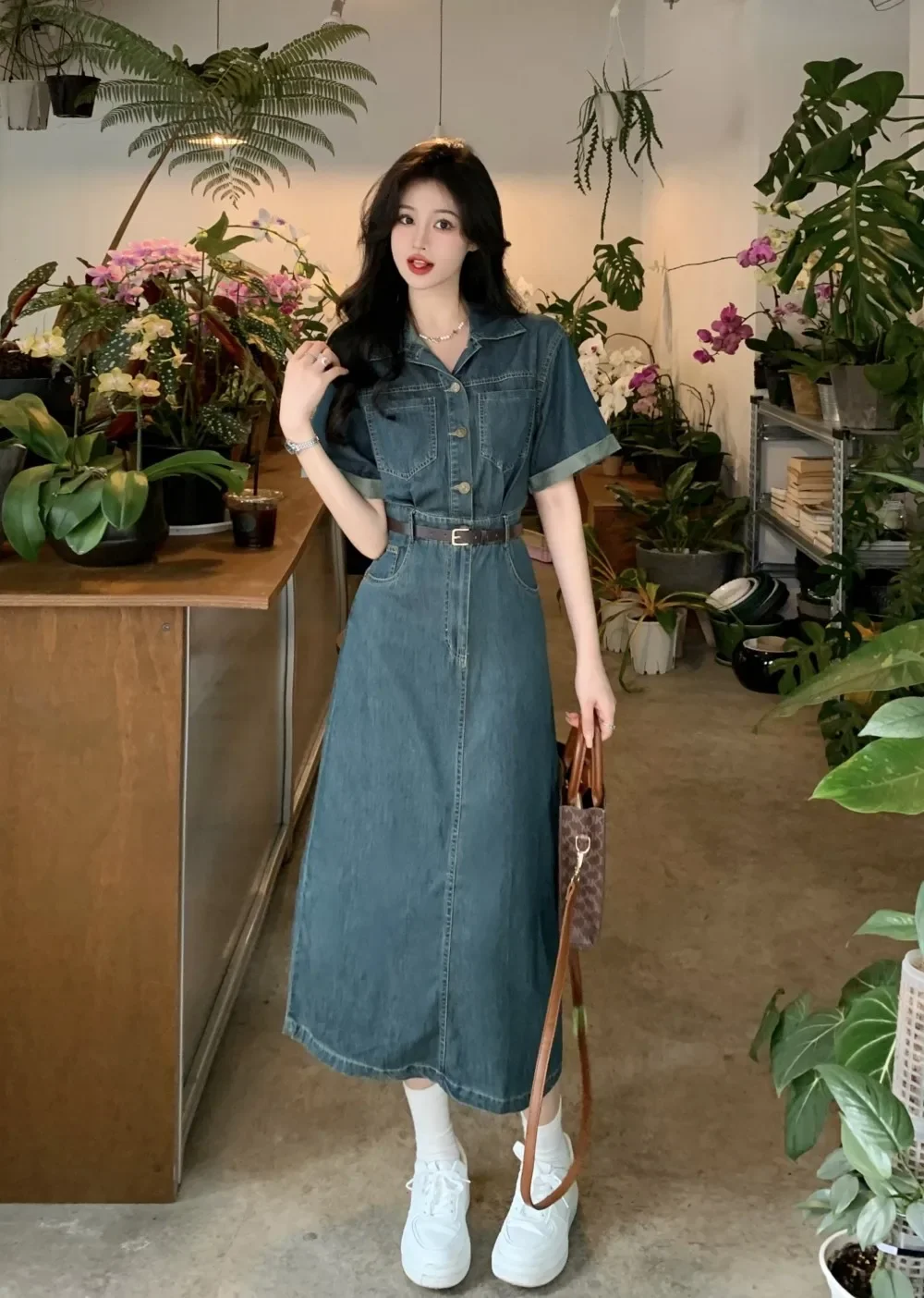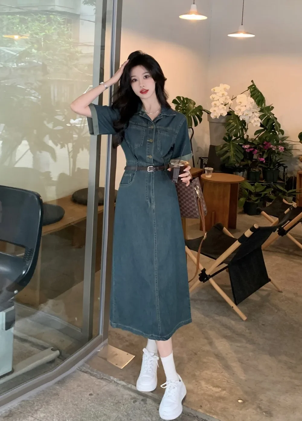 Retro Hong Kong style cowboy dress summer niche design high-end temperament French short-sleeved long skirt women's clothing