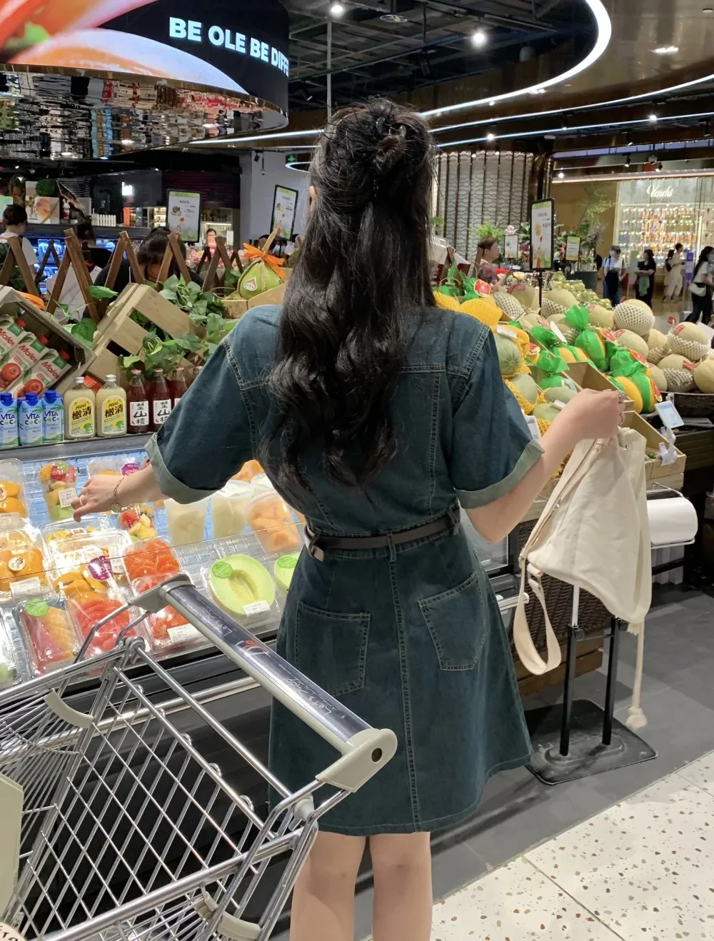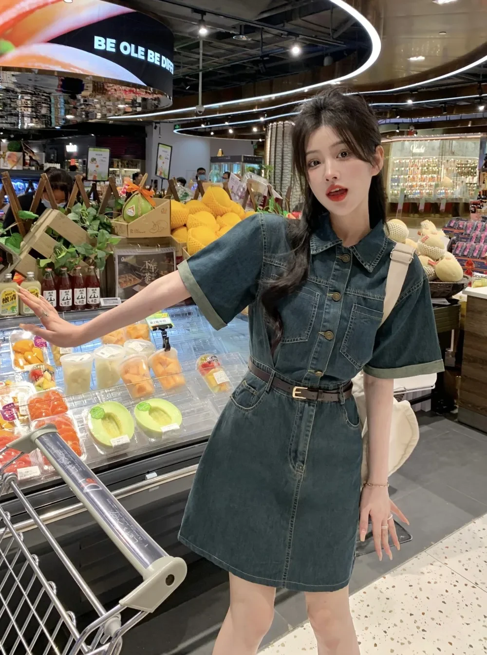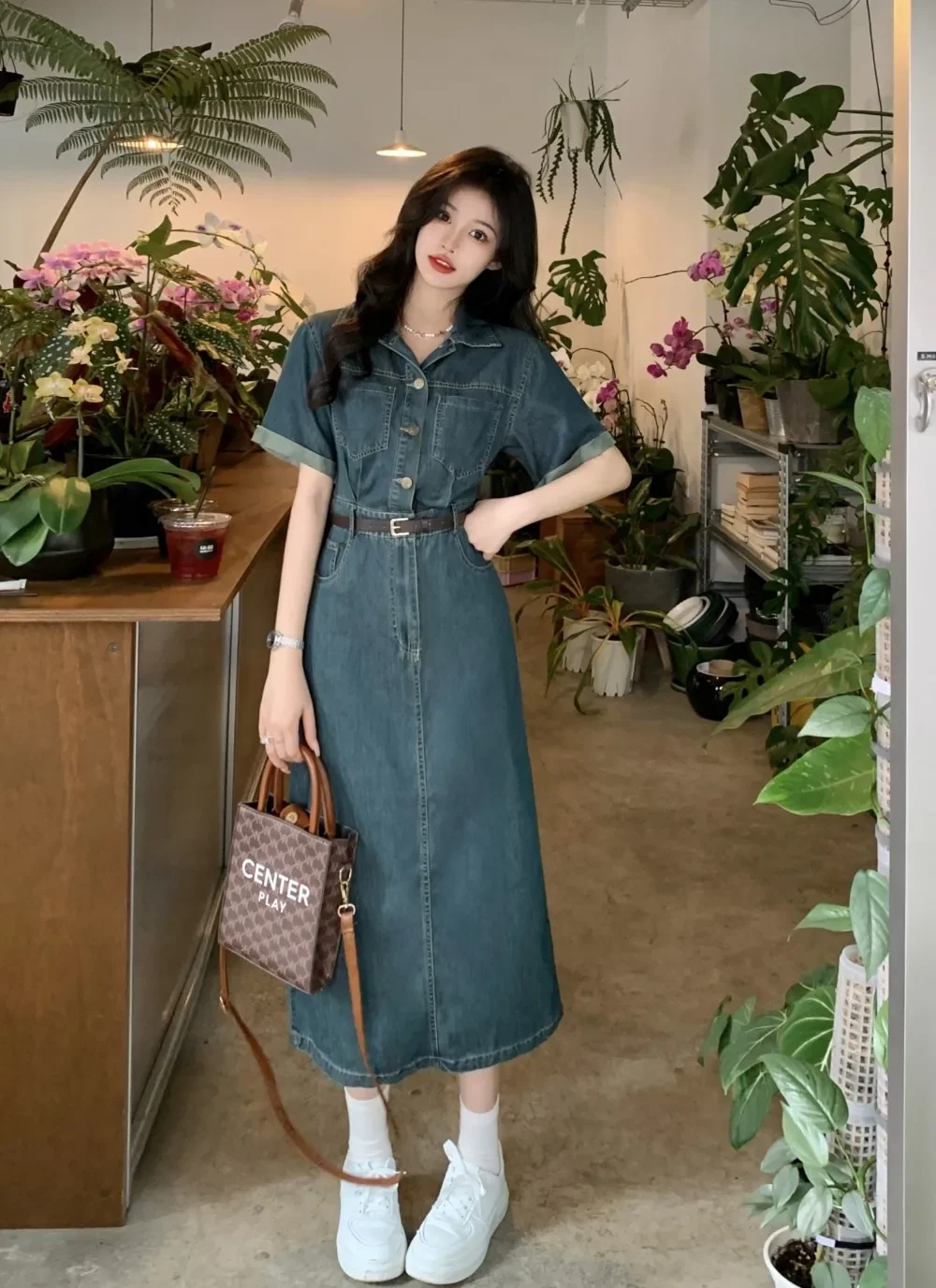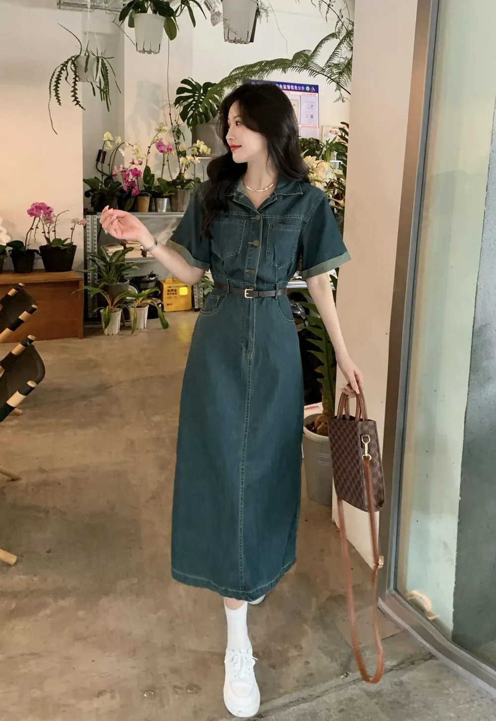 Retro Hong Kong style cowboy dress summer niche design high-end temperament French short-sleeved long skirt women's clothing